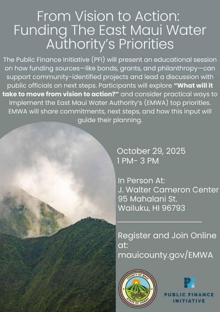 · Wailuku (and online): 1-3 p.m., Wednesday, Oct. 29, at J. Walter Cameron Center; online via Microsoft Teams by registering at https://www.mauicounty.gov/EMWA. Nonprofit Public Finance Initiative will offer an education session titled, “From Vision to Action: Funding the East Maui Water Authority’s Priorities,” on how funding sources, such as bonds, grants and philanthropy, can support community-identified projects and lead a discussion with public officials on next steps. Participants will explore the question — “What will it take to move from vision to action?” — and consider practical ways to implement EMWA priorities.
