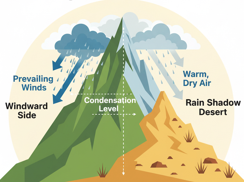 A graphic shows “orographic” precipitation. When winds carrying moisture-laden air encounter mountains and move up and over them, cooler temperatures cause water vapor to condense and produce rain. A shift in prevailing wind patterns, even slightly from the northeast to east, means that rain falls away from long-established water catchment and treatment systems on Maui. Simply put, the rain spigot has moved but the buckets have not.