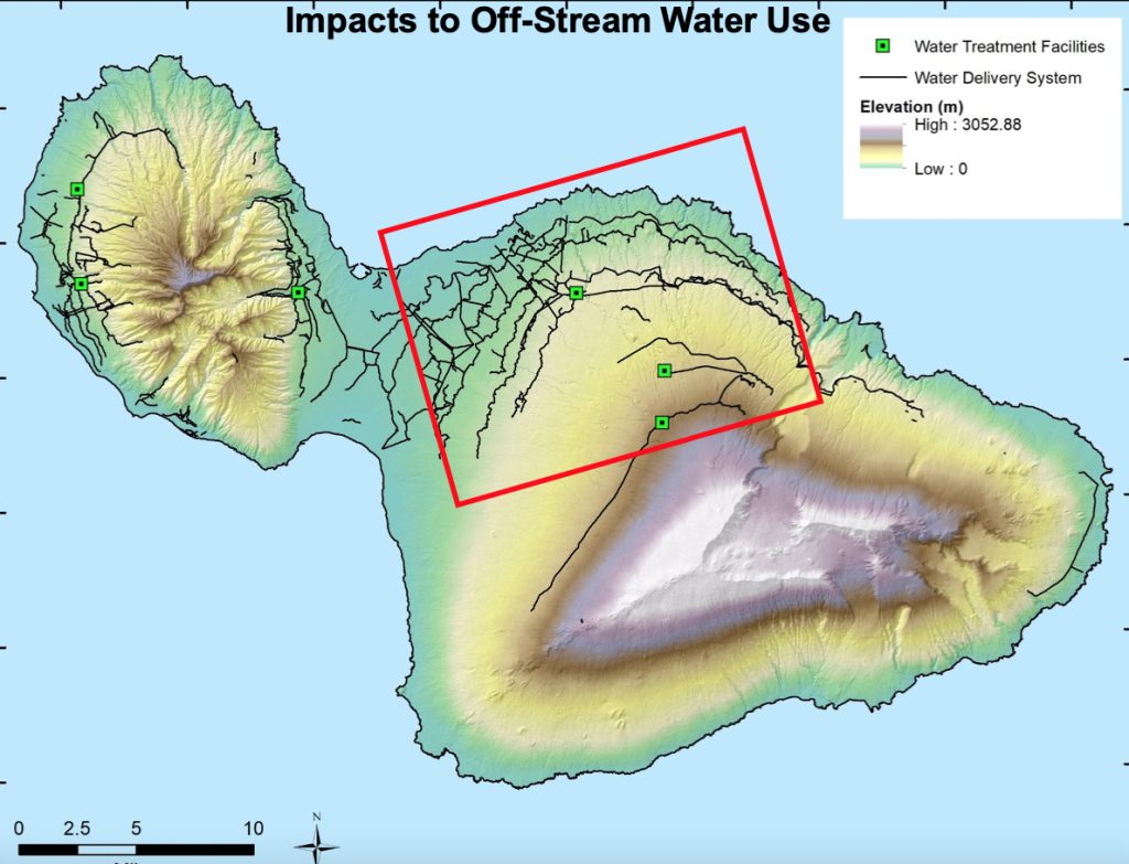 A map shows the current location of water treatment plants and water delivery systems, largely fanned out in northeast Maui, not in East Maui where prevailing trade winds have been shifting over the past few decades. PC: CWRM