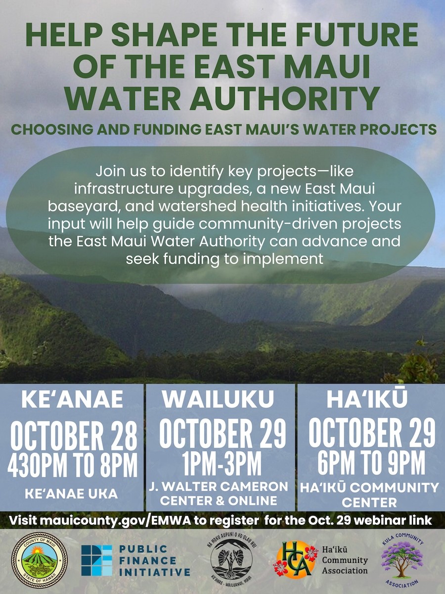 See Article in the Community News: https://hanamaui.com/community-invited-to-help-shape-the-future-of-east-maui-water-authority-at-october-workshops/ |