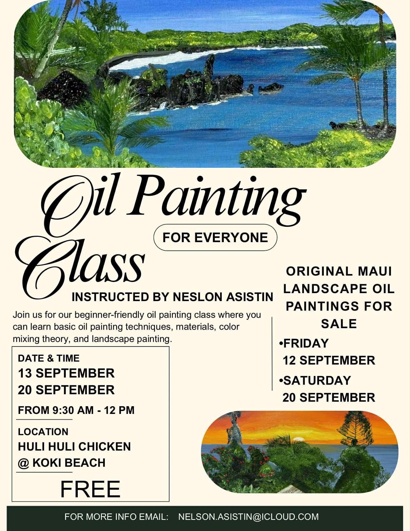 Koki Koki Beach, Hana, HI, United StatesOil Painting Class — Free & Open to All! Discover the joy of oil painting with local artist Nelson Asistin! ️ This beginner-friendly class will cover basic techniques, materials, color mixing, and landscape painting inspired by Maui’s beauty. Location: Huli … Read More