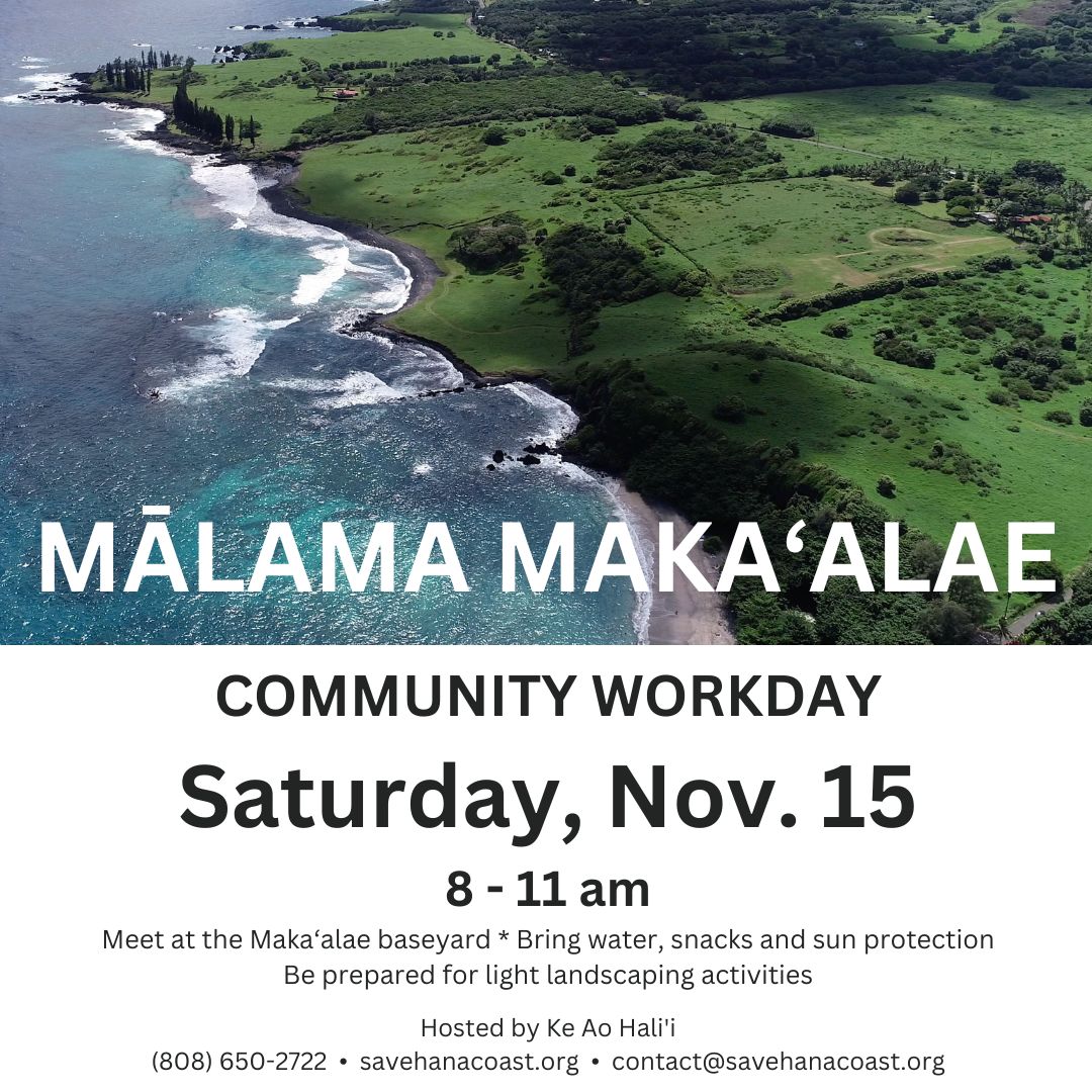 Maka'alae Hana Highway, Hana, HI, United StatesAloha Save Hana Coast Supporters, Please join us for our monthly community work party, this month we'll be working at Maka'alae. Meet at the Maka'alae baseyard. Bring water, sun/rain protection, work clothes, hand tools, be prepared for light landscaping activities. … Read More